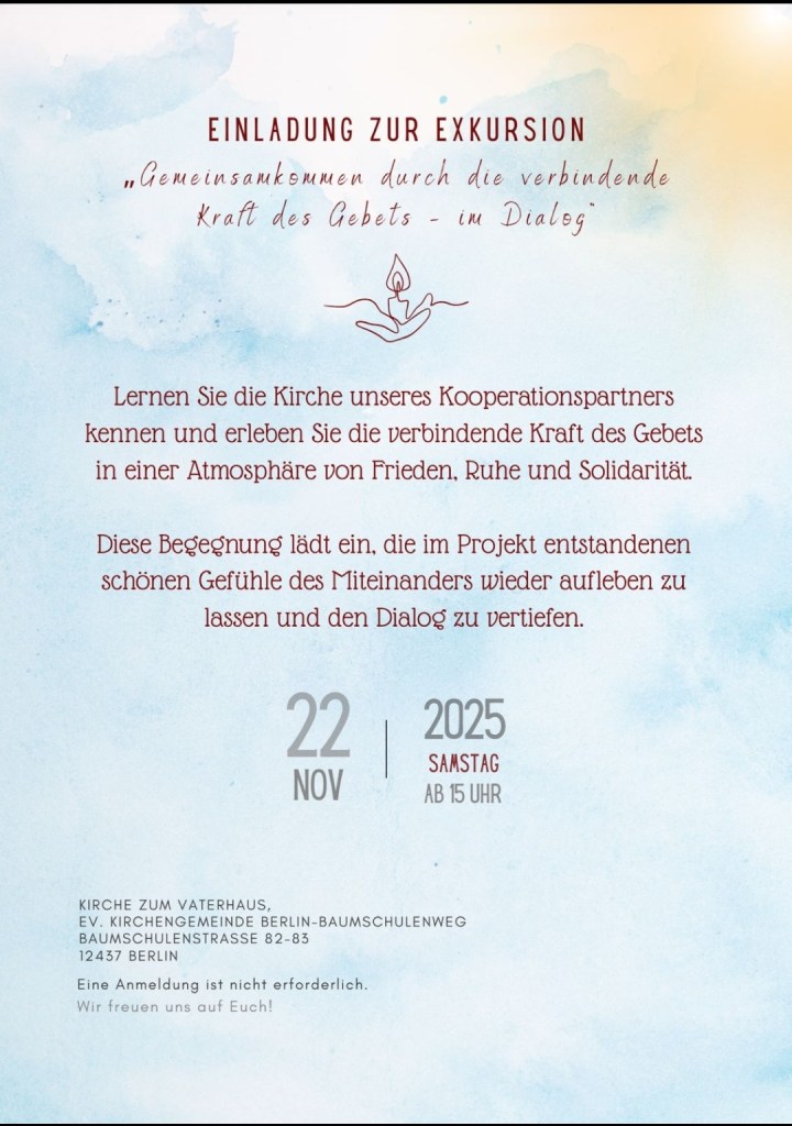 Wir dürfen wieder Gastgeber:innen sein und freuen uns sehr über das Interesse von femia an unserer Kirche. Im Anschluss an eine Führung werden wir im Gemeindesaal ein Agape-Mahl feiern und gemeinsam beten.