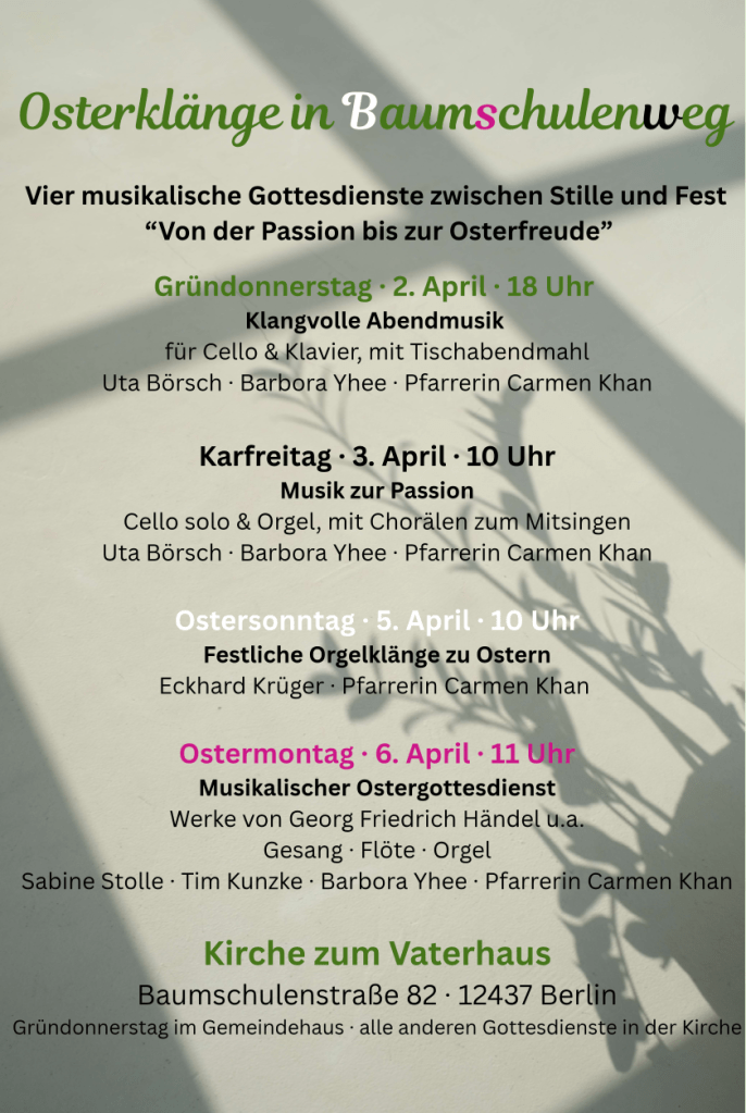 „Von der Passion bis zur Osterfreude“ laden wir ein, Ostern gemeinsam zu erleben – mit Musik, Besinnung und festlichen Momenten.